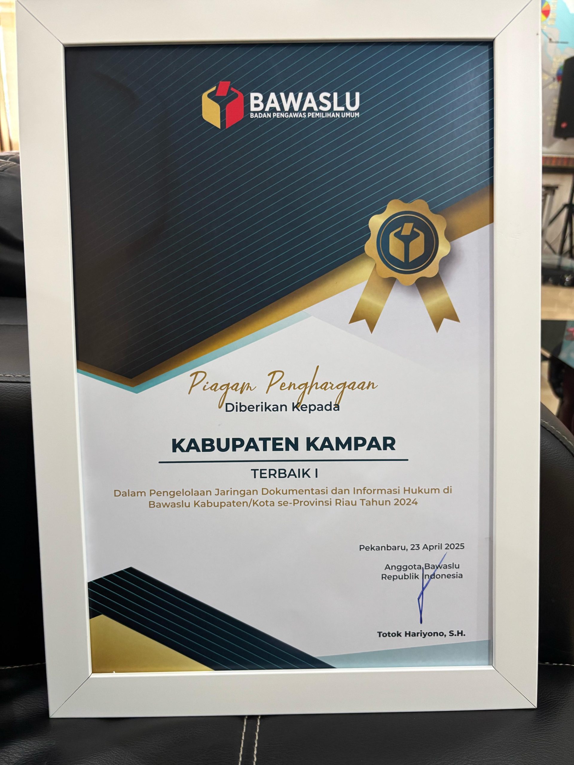 PEKANBARU, Bertuahnews.com – Bawaslu Kampar-Bawaslu Kabupaten Kampar meraih peringkat terbaik Pertama dalam pengelolaan Jaringan Dokumentasi dan Informasi Hukum (JDIH) Se-Provinsi Riau Tahun 2024, Penghargaan tersebut diberikan oleh Anggota Bawaslu Republik Indonesia, Totok Hariyono, Rabu (23/4/2025) di Aula Bawaslu Riau.
