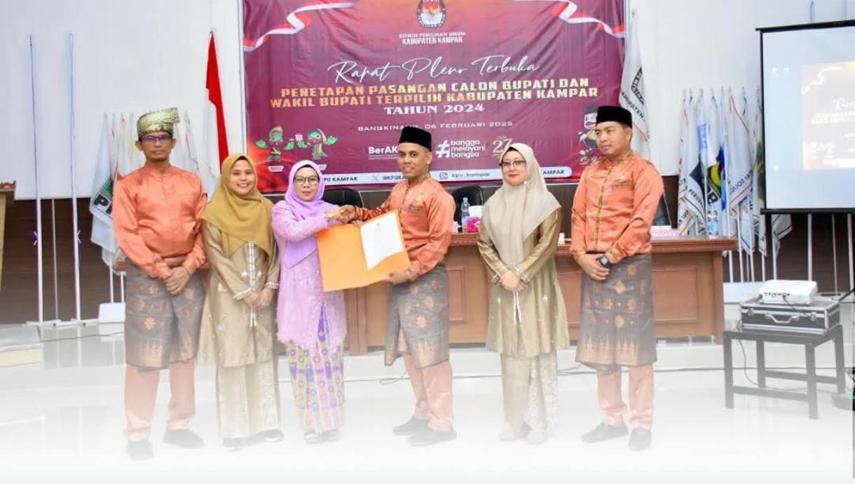 Maka Komisi Pemilihan Umum (KPU) Kabupaten Kampar, melaksanakan rapat pleno terbuka untuk menetapkan pasangan calon Bupati dan Wakil Bupati terpilih kabupaten kampar tahun 20024.