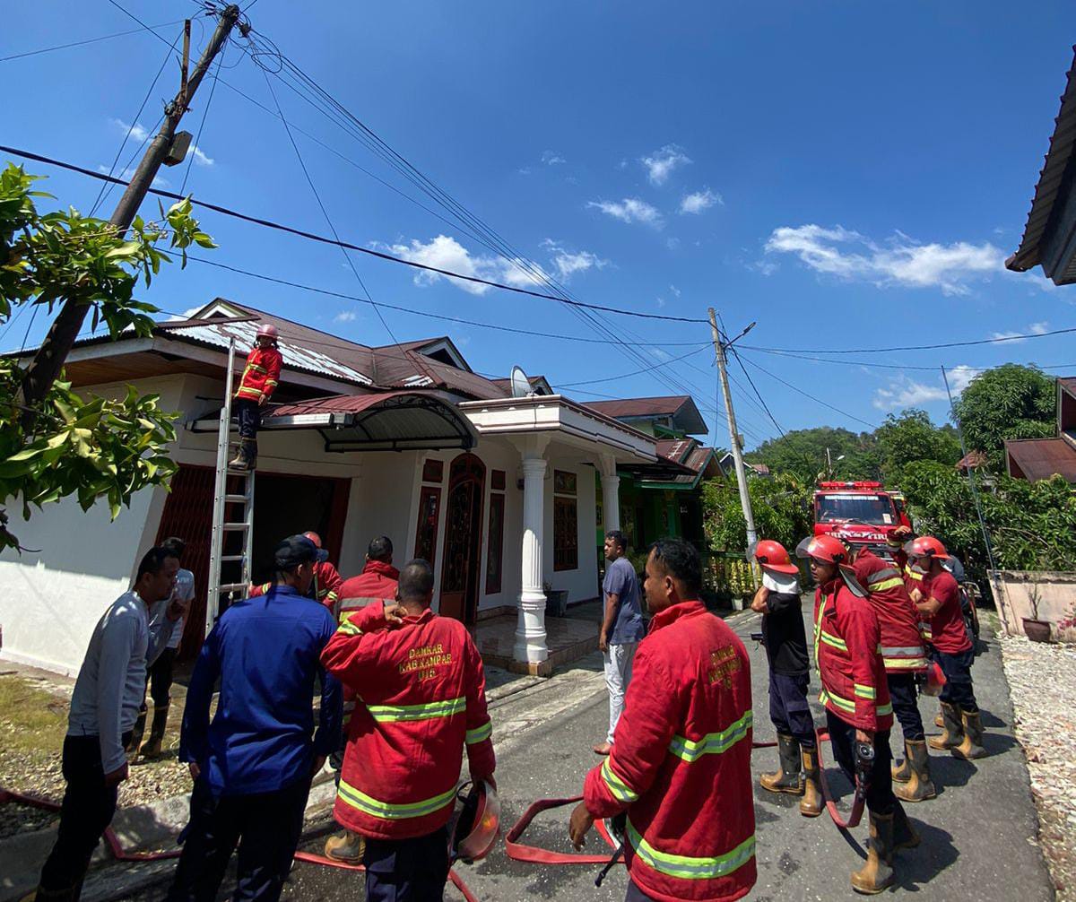 Petugas dari Damkar melakukan pemadaman deteksi dini dengan dugaan terjadi konsleting listrik disalah satu unit bangunan rumah milik warga di Jalan Jenderal Sudirman Gang Rahman, RT 001/RW 018, Kelurahan Langgini, Kecamatan Bangkinang Kota, Kabupaten Kampar.
