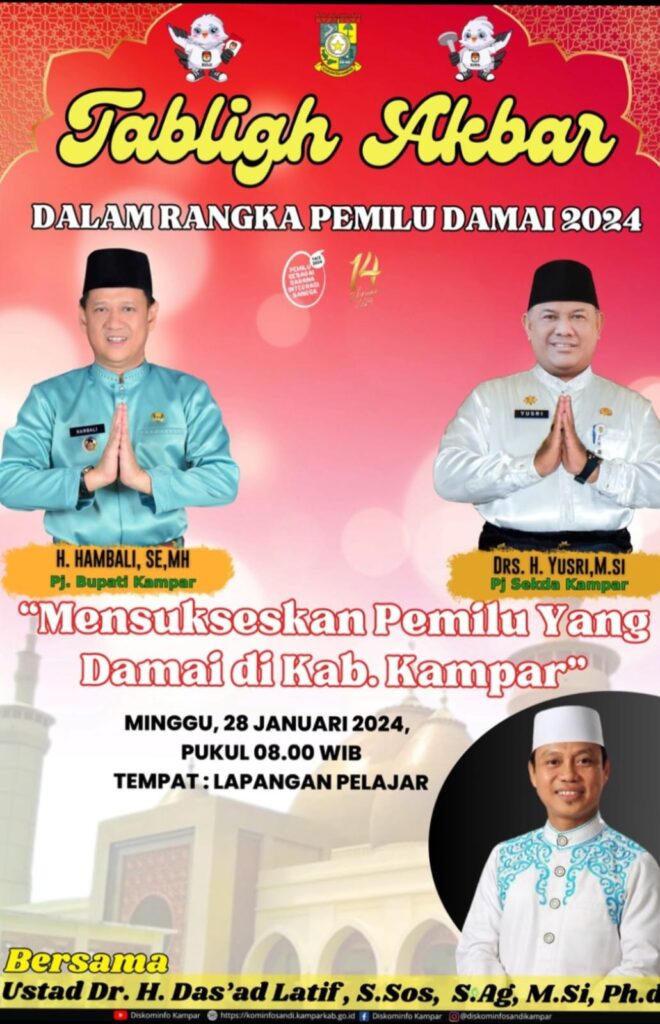 Tidak tanggung-tanggung Tabligh Akbar yang digelar pada hari Minggu tanggal 28 Januari 2024 di Lapangan Pelajar Bangkinang Kota menghadirkan Penceramah Kondang Ustadz Dr. H. Das’ad Latif, S. Sos. S. Ag. M. Si. Ph.D yang merupakan seorang ulama, akademikus, dan dosen ilmu komunikasi berkebangsaan Indonesia yang aktif mengajar di Universitas Hasanuddin.