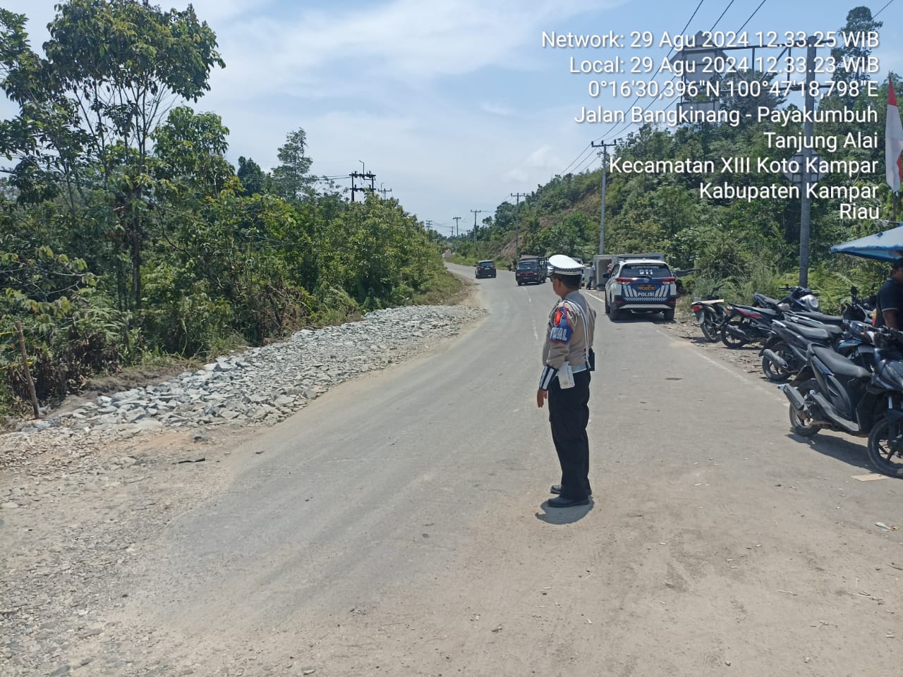 Bertuahnews.com, Kampar — Kapolres Kampar, AKBP. Ronald Sumaja melalui Kasat Lantas Polres Kampar, AKP. Vino Lestari bersama personil lakukan tindakan cepa pasca terjadinya jalan yang amblas di lintas Sumbar – Riau tepatnya di kilometer 106 di Desa Tanjung Alai, Kecamatan XIII Koto Kampar yang sempat terjadi kemacetan.