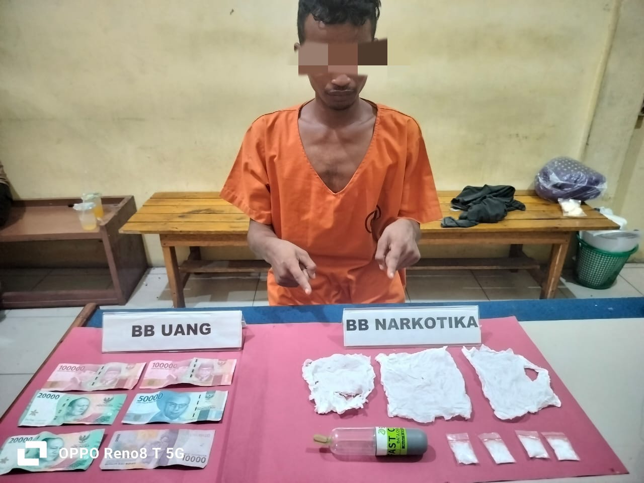 Dan dilakukan penggeledahan dan ditemukan barang bukti 4 paket sedang Narkotika jenis shabu yang dibungkus plastik bening, uang Rp 300 ribu, 3 lembar tissue dan kotak kabel data warna hijau.