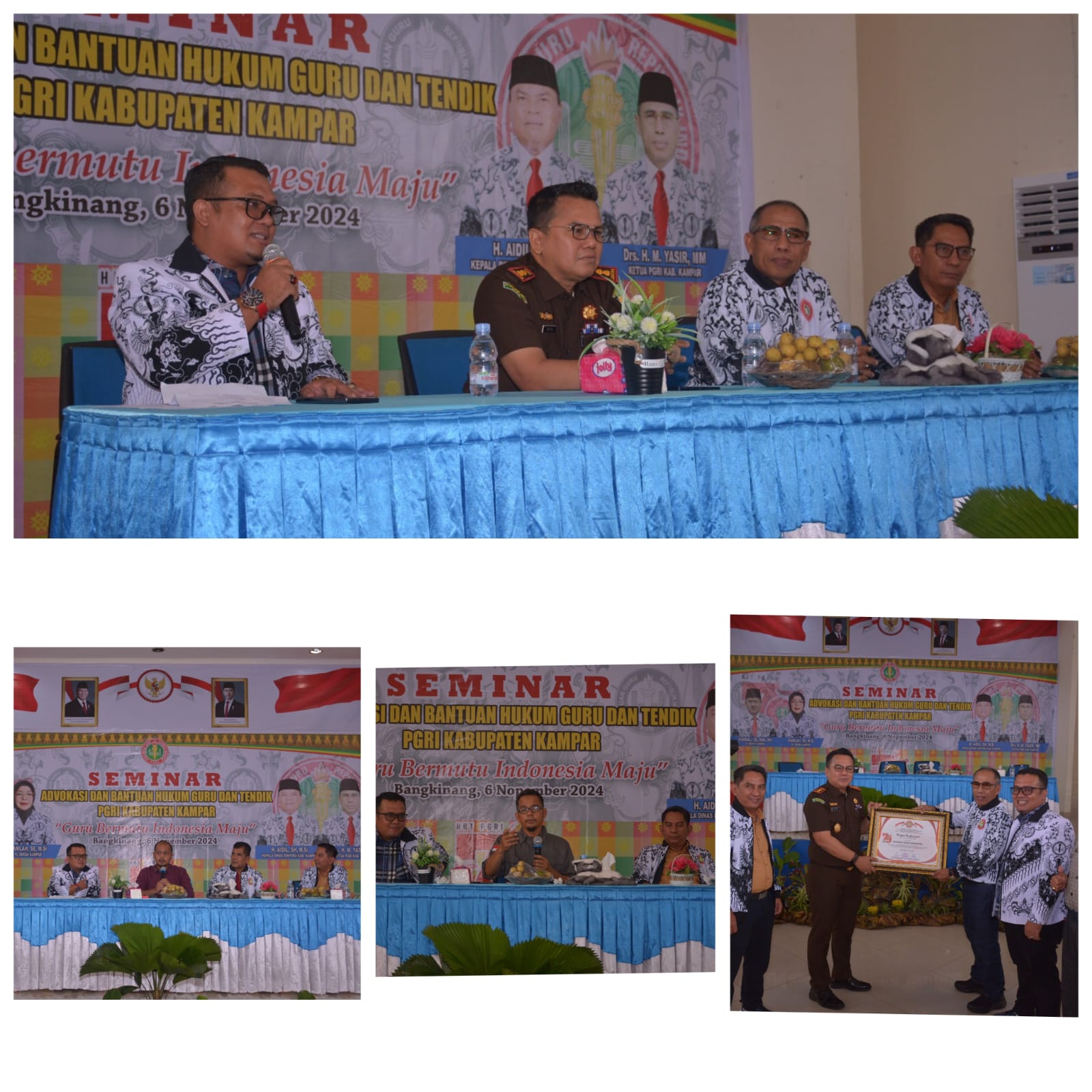 Ketua PGRI Kabupaten Kampar H.M Yasir membuka secara langsung seminar ini dan diisi Narasumber Kepala Kejaksaan Kabupaten Kampar Sapta Putra dengan Materi Membina Kesadaran Hukum dalam rangka Penguatan Advokasi dan Bantuan Hukum bagi Guru dan Tenaga Kependidikan, dari Polres Kampar yang di wakili Kasat Reskrim AKP Elvin Akbar Putra dengan materi Penegakan Hukum dalam rangka membangun lingkungan sekolah yang baik, aman dan nyaman serta netralits ASN dalam Pilkada serentak 2024 kemudian dari PWI Kabupaten Kampar yang disampaikan oleh Dewan Penasehat PWI Kampar Marhaliman dengan materi Keterbukaan Informasi Publik serta UU nomor 40 tahun 1999 tentang Pers.