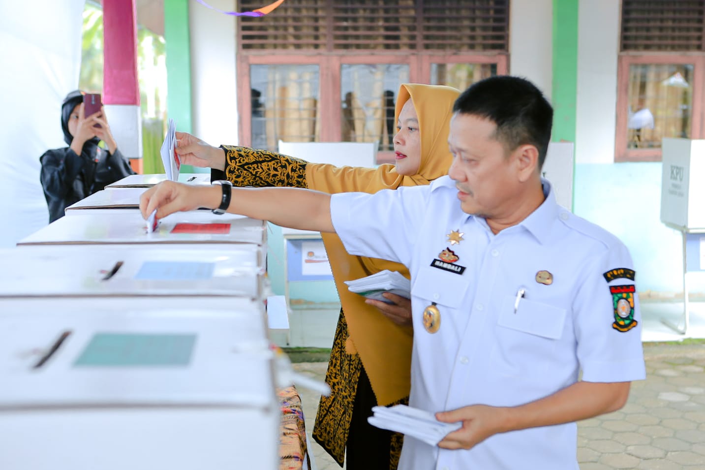Salo Timur, BertuahNews – Pj. Bupati Kampar Hambali, SE, MH, dan Pj Ketua TP PKK Kabupaten Kampar Ricana Djayanti Hambali beserta anak memberikan hak suaranya (nyoblos) di TPS 07 Desa Salo Timur Kecamatan Salo Kabupaten Kampar. Rabu,14/2/24.