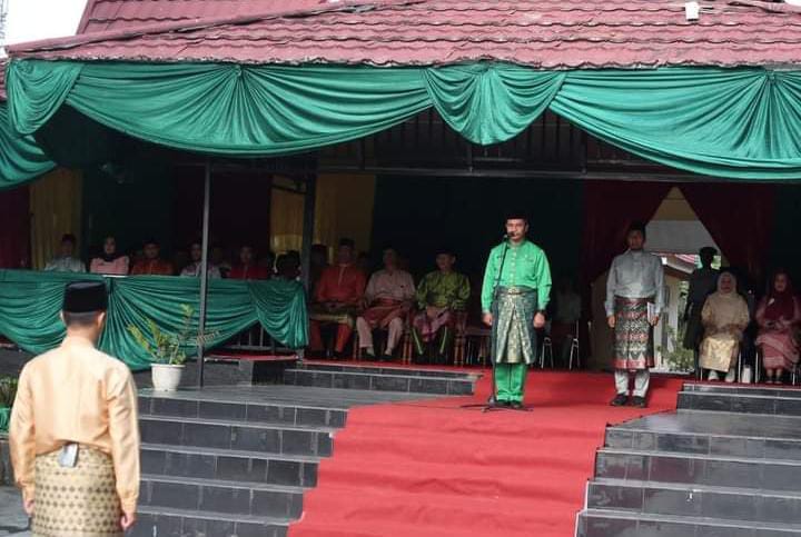 Pj Sekda Kampar membacakan Amanat Pj Gubernur Riau SF. Haryanto menyampaikan yang man dalam suasana yang penuh rahmat ini, dapat berkumpul memperingati Hari Jadi ke-67 Provinsi Riau dengan penuh suka cita. Dan momentum ini tidak hanya menjadi perayaan pergantian usia, tetapi juga menjadi semangat dalam kebersamaan untuk menghadapi berbagai tantangan ke depan.