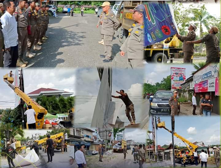 BANGKINANG KOTA – Satuan Polisi Pamong Praja (Satpol PP) Kabupaten Kampar laksanakan penertiban terhadap Alat Peraga Kampanye (APK) para pasangan calon Bupati Kampar dan APK pasangan calon Gubernur, Senin (25/11/2024).